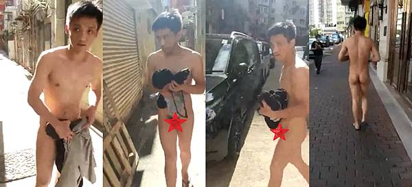 片段中男子在拍攝者指示下,手持衣物,全身僅穿著一對人字拖,