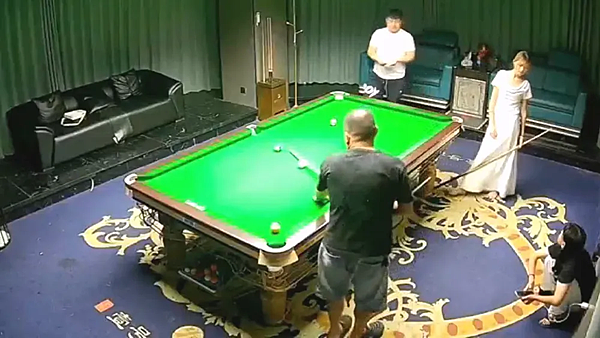 之後換男子拿出「短桿」不停地「一桿進洞」,大約6分鐘後結束這場撞球間激戰。